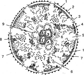 Рис. 1.11. Интерфазное ядро: 1 — перихроматиновые гранулы; 2 — ядерная оболочка (две мембраны, внешняя и внутренняя, и между ними перинуклеарное пространство); 3 — ядерная пора; 4— конденсированный хроматин; 5 — кариоплазма (ядерный сок); 6 — диффузный хроматин; 7— перихроматиновые фибриллы; 8 — интерхроматиновые гранулы; 9 — ядрышко