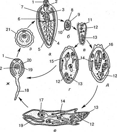 1 — ротовая присоска; 2 — брюшная присоска; 3 — матка; 4 — семенник; 5 — желточник; 6 — скорлуповая железа; 7— яичник; 8 — яйцеклетка; 9 — скорлупа (защитная оболочка); 10 — питающие клетки; 11 — мозг с глазным пятном; 12 — эмбрионы; 13 — зародышевые клетки; 14 — протонефридий; 15 — церкария; 16 — редия; 17 — радиальное отверстие; 18 — хвост; 19 — кишка; 20 — железки, выделяющие вещество капсулы; 21 — капсула адолескарии