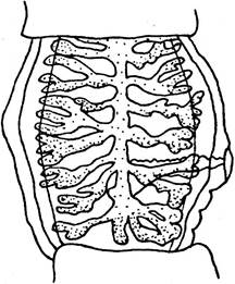 3. Матка “зрелого” членика свиного цепня образует 7 — 12 ответвлений с каждой стороны, а у бычьего — от 17 до 35 ответвлений, что служит диагностическим признаком.