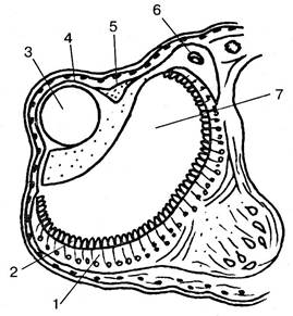 Рис. 3.57. Разрез через глаз кольчатого червя: 1 — сетчатка: 2 — рецепторы; 3 — хрусталик; 4 — роговица; 5 — сократительные волокна; 6 — железистая клетка; 7 —стекловидное тело