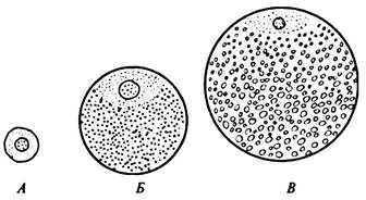 Рис. 11.2. Типы яйцеклеток хордовых животных: А — яйцеклетка человека; Б — яйцеклетка земноводных; В — яйцеклетка птиц