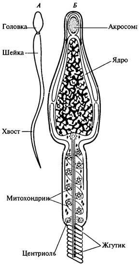 Рис. 11.3. Строение сперматозоида: А — общий вид; Б — схема строения