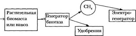 Вместе с тем добыча и потребление нефти ежегодно увеличивается в среднем на 8%. По оценкам специалистов разведанных запасов хватит только на ближайшие 50-70 лет. Нельзя ли использовать современные растительные и животные остатки для производства если не нефти, то хотя бы газа (он называется биогазом)? Оказывается, это вполне возможно и уже в значительных масштабах используется во многих развивающихся странах (Индия, Китай). На заводах по производству биогаза в качестве сырья используются отходы животного и растительного происхождения, которые перегнивают в генераторах под действием анаэробных бактерий (рис. 4). Подобно природному газу, биогаз состоит главным образом из метана. Его можно использовать непосредственно для отопления жилищ, приготовления пищи или получения электроэнергии с помощью электрогенератора. Остатки растительных и животных отходов после получения биогаза могут использоваться в качестве высокоэффективных экологически чистых удобрений, т. к. содержат значительное количество связанного азота.