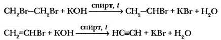 2. Дегидрогалогенирование дигалогеналканов. Один из способов получения соединений с двойной связью — отщепление молекулы галогеноводорода от галогеналкана. Учащиеся вспоминают эту реакцию, и учитель под их диктовку записывает ее на доске. Затем ставит проблему: можно ли подобным образом «построить» тройную связь? Что для этого необходимо? Вероятно, для этого нужно взять производное предельного углеводорода с двумя атомами галогена. Как должны быть расположены эти два атома в углеродной цепи? Теоретически существует два возможных варианта: два атома галогена при одном либо при соседних углеродных атомах. Действительно, в 60-х гг. XIX в. молодым русским ученым М. Мясникову и В. И. Савичу удалось получить ацетилен взаимодействием 1,2-дибромэтана с кипящим спиртовым раствором гидроксида калия: