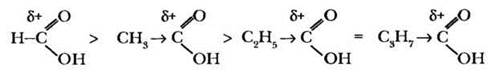 В классах с углубленным изучением химии учитель обязательно рассматривает влияние углеводородного радикала на силу карбоновой кислоты. Она определяется величиной частичного положительного заряда на атоме углерода карбоксильной группы. Чем больше этот заряд, тем в большей степени диссоциирует кислота, тем она сильнее. На величину δ+ атома углерода влияет заместитель, связанный с карбоксильной группой. В гомологическом ряду карбоновых кислот их сила падает с увеличением углеводородного радикала, то есть наиболее сильной является муравьиная кислота: