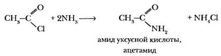 3) Образование амидов (X = NH2). При взаимодействии хлорангидридов кислот с аммиаком образуются производные кислот, называемые амидами: