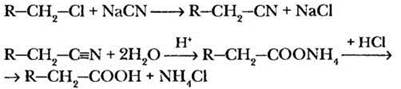 Карбоновые кислоты могут быть получены гидролизом их многочисленных производных. Однако практически используются лишь отдельные реакции, поскольку большинство производных сами получаются из кислот. Наибольшее значение имеет гидролиз нитрилов. Учитель напоминает, что такой прием позволяет увеличивать длину углеродной цепочки на один атом.