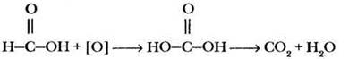 Учитель ставит перед ребятами проблемную ситуацию и при наличии в лаборатории муравьиной кислоты (или аптечного муравьиного спирта) иллюстрирует ее демонстрационным экспериментом. Оказывается, раствор муравьиной кислоты дает реакцию «серебряного зеркала». Почему? Внимательное рассмотрение структурной формулы этого вещества приведет ребят к выводу, что в этой кислоте имеется альдегидная группа, поэтому она обладает также свойствами альдегидов. Что же образует муравьиная кислота при окислении? Если под действием реактива Толленса альдегидная группа окисляется до карбоксильной, должно получиться вещество следующего строения: