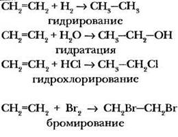 2. Реакции присоединения. Учитель просит ребят «вслушаться» в звучание термина «присоединение» и сравнить его со словом «соединение». Быть может, кто-нибудь обратит внимание, что «присоединение» подразумевает прибавление чего-то меньшего к чему-то главному, а соединение - сочетание равнозначных фрагментов. Для того чтобы вступить в реакцию присоединения, органическая молекула должна иметь кратную связь (или цикл), эта молекула будет главной (субстрат). Молекула попроще (часто неорганическое вещество, реагент) присоединяется по месту разрыва кратной связи или раскрытия цикла.