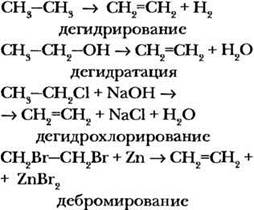 3. Реакции отщепления. В англоязычной транскрипции их называют реакциями элиминирования (от английского eliminate - устранять). Такие реакции немного напоминают реакции разложения в неорганической химии, но также имеют специфику. Их можно рассматривать как процессы, обратные присоединению, поскольку в результате чаще всего образуются кратные связи или циклы. Быть может, при объяснении этого материала имеет смысл ввести и сопоставить термины гидрирование-дегидрирование, гидратация-дегидратация, гидрогалогенирование-дегидрогалогенирование, галогенирование-дегалогенирование:
