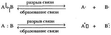 Как следует из схемы, в результате разрыва связи могут образовываться как частицы с неспаренным электроном (атомы или радикалы), так и заряженные частицы — ионы (катионы или анионы). В первом случае общая пара электронов «поровну» делится между связанными атомами. Такой разрыв называется гомолитическим. Во втором случае оба электрона ковалентной связи остаются у одного атома, атома более электроотрицательного элемента. Это гетеролитический разрыв связи.