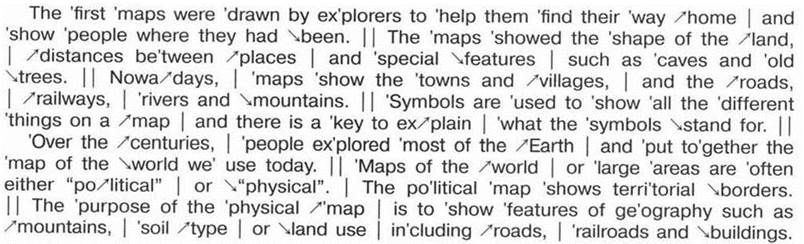 The first maps were drawn by explorers to help them find their way home and show people where they had been. || The maps showed the shape of the land, | distances between places and special features such as caves and old trees. || Nowadays, | maps show the towns and villages, | and the roads, | railways, | rivers and mountains. || Symbols are used to show all the different things on a map and there is a key to explain what the symbols stand for. ||