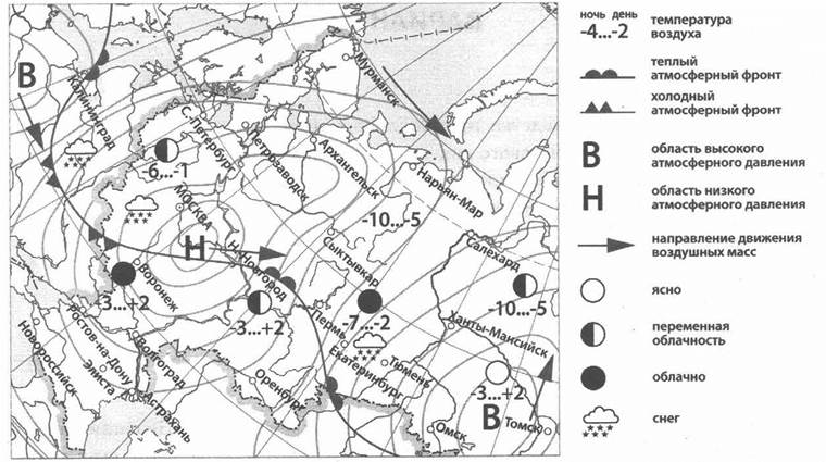 4. На одном из сайтов в Интернете были размещены карта погоды на 7 декабря 2012 г. и выдержки из прогноза погоды на этот день. Какие выводы о погоде на Европейской части России и в Западной Сибири подтверждаются сведениями карты? Запишите номера предложений, в которых указаны верные сведения.