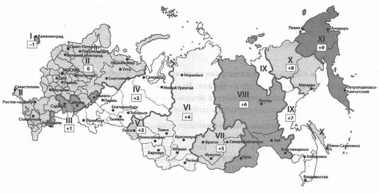 7. В каких из перечисленных регионов России Новый год уже наступил в 23 часа по времени Новосибирска? Запишите цифры, под которыми указаны эти регионы.