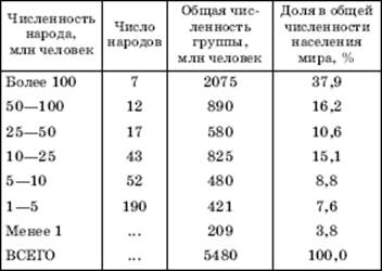 Анализ таблицы 56 показывает, что в начале 1990-х гг. 321 народ, насчитывавший более 1 млн человек каждый, составлял 96,2 % всего населения земного шара. В том числе на 79 народов с численностью более 10 млн человек приходилось почти 80 % населения, на 36 народов численностью более 25 млн человек – около 65 % и на 19 народов численностью более 50 млн человек каждый – 54 % населения. К концу 1990-х гг. количество самых крупных народов выросло до 21, а доля их в мировом населении приблизилась к 60 % (табл. 57).