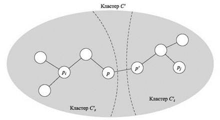 Другими словами, выполняется алгоритм Крускала, но он останавливается перед добавлением последних k - 1 ребер. Происходящее эквивалентно построению полного минимального остовного дерева T (в том виде, в каком оно было бы построено алгоритмом Крускала), удалению k - 1 ребер с наибольшей стоимостью (которое наш алгоритм вообще не добавлял) и определению k-кластеризации по полученным компонентам связности C1, C2,..., Ck. Итак, итеративное слияние кластеров эквивалентно вычислению минимального остовного дерева с удалением самых “дорогостоящих” ребер.