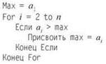 Вычисление максимума из n чисел может быть выполнено классическим “однопроходным” методом. Допустим, числа поступают на вход в виде списка или массива. Числа a1, a2, ... обрабатываются последовательно, с сохранением текущего максимума во время выполнения. Каждое очередное число аi сравнивается с текущим максимумом, и если оно больше, текущий максимум заменяется значением ai.