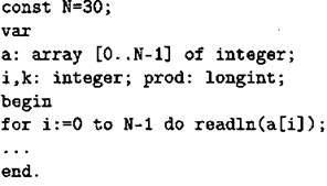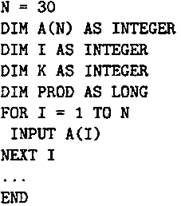 Объявляем массив А из 30 элементов. Объявляем целочисленные переменные I, К и PROD. В цикле от 1 до 30 вводим элементы массива А с 1-го по 30-й. |