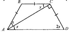 1. Если на одной из двух прямых отложить последовательно несколько равных отрезков и через их концы провести параллельные прямые, пересекающие вторую прямую, то они отсекут на второй прямой равные между собой отрезки. 2. В равнобедренной трапеции углы при основаниях равны, диагонали равны. 3. ∆ABC - равнобедренный. ∠BAC = ∠BCA = х°, как внутренние накрест лежащие при ВС || AD и секущей АС,∠BAD = ∠CDA = 2х°. Из прямоугольного ∆ACD: ∠CAD + ∠CDA = 90° => х = 30°. В трапеции ABCD ∠BAC = ∠CAD = 60°, ∠BCD = 120° |