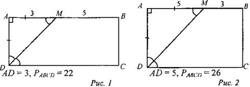 (И/Ф)1. Решите задачу: В прямоугольнике ABCD биссектриса угла D пересекает сторону АВ в точке М. Докажите, что ∆ADM - равнобедренный. Найдите периметр прямоугольника, если сторона АВ оказалась разбита на отрезки длиной 3 см и 5 см. Сколько решений имеет задача? 2. Решите № 403. Дано: ABCD — прямоугольник, АС ∩ BD = О, ∠CAD = 30°, АС = 12 см. Найти: РAOB |