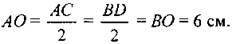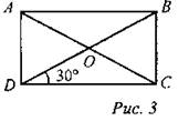 Решение: ∆ACD - прямоугольный, в нем ∠CAD = 30°, значит, тогда АВ = CD = 6 см. В прямоугольнике диагонали равны и точкой пересечения делятся пополам, то есть РAOB = АО + ВО + АВ = 6 + 6 + 6 = 18 см. Ответ: РАOB = 18 см |