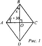 (И) При выполнении работы учитель контролирует работу менее подготовленных учащихся, оказывая при этом необходимую индивидуальную помощь. По окончании работы проводится самопроверка. Самопроверку можно организовать следующим образом: заранее подготовить решение на листочках и по окончании работы раздать листочки ученикам для проверки и исправления ошибок. 1. Найдите углы ромба, если его диагонали составляют с его стороной углы, один из которых на 30° меньше другого. Диагонали ромба взаимно перпендикулярны, поэтому ∆АОВ - прямоугольный. Пусть в ∆АОВ ∠ABO = х, тогда ∠BAO= х + 30°, значит ∠ABO + ∠BAO = x + x + 30° = 90° и х = 30°. ∠ABO = 30°, ∠BAO = 60°, а так как диагонали ромба являются биссектрисами его углов, то ∠BAD = 120°, ∠ABC = 60°. Поскольку противолежащие углы в ромбе равны, то ∠ADC = ∠ABC = 60°, ∠BCD = ∠BAD = 120°. Ответ: 60°, 120°, 60°, 120°.