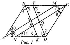 № 428. Решение: 1) DP - биссектриса => ∠1 = ∠2. 2) ∠1 = ∠3, как внутренние накрест лежащие при ВС || AD и секущей PD. Имеем ∠1 = ∠2 = ∠3. 3) Аналогично для биссектрисы угла В имеем ∠4 = ∠5 = ∠6.