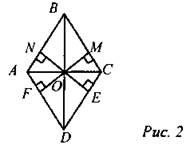 4) Но ∠ABC = ∠ADC, поэтому ∠1 = ∠2 = ∠3 = ∠4 = ∠5 = ∠6. ∠5 и ∠3 соответственные при прямых PD и ВК и секущей ВС => PD|| ВК. 5) Аналогично доказывается, что AM || NC. 6) STQR - параллелограмм по определению. 7) ∆PCD - равнобедренный, так как ∠3 = ∠2, CQ — биссектриса и высота. 8) В параллелограмме STQR один угол прямой => он является прямоугольником. № 434. Дано: ABCD - ромб, АС ∩ BD = О. Доказать: ON = ОМ = ОЕ = OF.