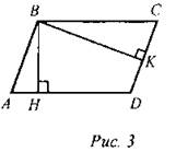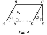 Доказательство: 1) Проведем ВН ⊥ AD, СЕ ⊥ AD. 2) ∆АВН = ∆DCE по гипотенузе и острому углу (АВ = СD как противолежащие стороны параллелограмма; ∠1 = ∠2, так как ∠2 = 180° - ∠ADC и ∠1 + ∠2 = 180°, как сумма внутренних односторонних углов при параллельных прямых АВ и CD и секущей AD; ∠AHB = ∠CED = 90°) => SABH = SDCE, DE = АН. 3) SABCD = SABH + SHBCD = SDCE + SHBCD = SHDCE. HBCE - прямоугольник, SHBCE = HE ∙ BH; HE = HD + DE, но так как DE = АН, то НЕ = АН + HD = AD, то есть SHDCE= AD ∙ ВН = a - ha, отсюда SABCD = a - ha |