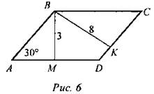 Вариант II Острый угол параллелограмма равен 30°, а высоты, проведенные из вершины тупого угла, равны 8 см и 3 см. Найти площадь параллелограмма. 1. Катет ВМлежит против угла в 30°, поэтому АВ = 2ВМ = 6 см. 2. SABCD = ВК ∙ DC = 8 ∙ 6 = 48 (см2).
