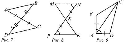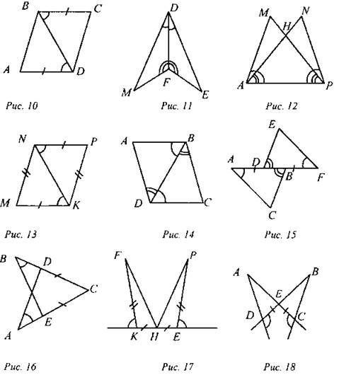(И/Ф) Найти пары равных треугольников и доказать их равенство. Решение: Рис. 7. Назовем точку пересечения отрезков АС и BD точкой О. Тогда ∆АОВ = ∆COD (по первому признаку). Рис. 8. Так как ∠N = ∠P, ∠MKN = ∠PKE, как вертикальные, NK = КР по условию, значит, ∆MKN = ∆ЕКР (по второму признаку). Рис. 9. АС - общая, АВ = AD, ∠BAC = ∠CAD, значит, ∆АВС = ∆ADC (по первому признаку). Рис. 10. BD - общая, AD = ВС, ∠ADB = ∠CBD, значит, ∆ABD = ∆CDB (по первому признаку). Рис. 11. DF - общая, ∠MFD = ∠EFD, ∠MDF = ∠EDF, тогда ∆MDF = ∆EDF (по второму признаку). Рис. 12. АР - общая, ∠NAP = ∠NPA, ∠МАР = ∠МРА, тогда ∆МАР = ∆NAP (по второму признаку). Рис. 13. NK - общая, MN = КР, NP = КМ, значит, ∆MNK = ∆PKN (по третьему признаку). Рис. 14. DB - общая, ∠ADB = ∠CBD, ∠ABD = ∠CDB, значит, ∆ADB = ∆CBD (по второму признаку). Рис. 15. Так как AD = BF, a DB - общая, то АВ = DF, ∠EDF = ∠СВА, ∠EFD =∠САВ, тогда ∆DEF = ∆ВСА (по второму признаку). Рис. 16. АС = ВС, ∠С - общий, ∠В = ∠А, значит, ∆СВЕ = ∆CAD (по второму признаку). Рис. 17. КН = НЕ, FK = РЕ, углы, равные смежным, тоже равны, значит, ∠FKH =∠РЕН и тогда ∆FKH = ∆РЕН (по первому признаку). Рис. 18. DE = ЕС, углы, равные смежным, тоже равны, тогда ∠ADE = ∠ВСЕ,∠AED = ∠ВЕС (как вертикальные), следовательно, ∆ADE = ∆ВСЕ (по второму признаку) |