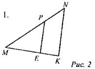 a) ∆BOC ~ ∆DOA. б) BO : DO = OC : OA = BC : DA = 4 : 12 = 1 : 3 = k. в) SBOC : SDOC = k2 = 1/9, значит, SBOC = 5 см2. Ответ: 5 см2. Вариант II 1. ∆МРЕ ~ ∆MNK по двум углам. МР : MN = ME : МК => МК = 9. РЕ : NK = 2 : 3. SMPE : SMKN = 4 : 9. Ответ: а) 9; б) 2 : 3; в) 4 : 9. 2. AB : MN = 2, BС : NK = 2, ∠B = ∠N => ∆ABC ~ ∆MNK АС : МК = 2 => АС = 14 см, ∠C = ∠K = 60°. Ответ: АС = 14 см, ∠C = 60°.