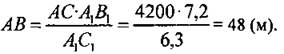 Возможный план: 1) На местности выбрать точку А и точку В1 на берегу реки так, чтобы АВ1 было перпендикулярно берегу. В - точка на противоположном берегу. 2) На берегу реки выбрать точку С, отличную от В1. 3) Измерить углы В1АС и АСВ. 4) На листе бумаги выполнить Picture в некотором масштабе и провести прямую В1С1 параллельно В1В. 5) Вычислить АВ, а затем В1В. АВ : АС = АВ1 : АС1 => АВ = АС ∙ АВ1 : АС и В1В = АВ – АВ1 № 582. ∆А1В1С1 ~ ∆ABC (по построению). Тогда Ответ: 48 м |