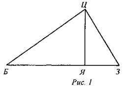 • Для измерения расстояния от точки Я до точки Б (см. рис. 1) рекомендуется вбить в точке Я жезл примерно в рост человека. К верхнему концу жезла Ц прилагается вершина прямого угла угольника так, чтобы один из катетов (или его продолжение) проходил через точку Б. Отмечается точка 3 пересечения другого катета (или его продолжения) с землей. Тогда расстояние БЯ относится к длине жезла ЦЯ так, как длина жезла к расстоянию ЯЗ. Для удобства расчетов и измерений жезл был разделен на 1000 равных частей.