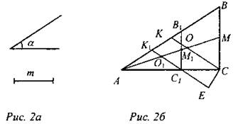 (Г) Каждую из задач учащиеся решают самостоятельно в группах, а затем идет обсуждение решения, выбор наиболее рационального способа. 1. Построить треугольник АВС по углу А, отношению сторон АВ : АС = 2 : 1 и расстоянию от точки пересечения медиан до вершины С. Дано: ∠A = α, О - точка пересечения медиан ААВС, ОС = т, АВ : АС = 2 : 1. Построить: ∆АВС. Построение: а) Построить угол А, равный α. б) На сторонах угла А отложить отрезки АС1 и АВ1 так, что АВ1 : АС1 = 2 : 1. в) Построить точку пересечения медиан треугольника АВ1С1 - точку O1. г) На луче O1С1 отложить отрезок O1Е, равный m. д) Построить прямую ЕС, параллельную медиане АМ1 треугольника АВ1С1, С = ЕС ∩ АС1. е) Через точку С провести прямую СВ, параллельную С1В1, СВ ∩ АВ1 = В. Треугольник АВС - искомый.