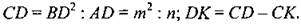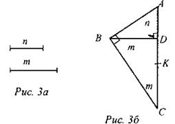 В прямоугольном ∆АВС BD - высота, проведенная из вершины прямого угла, поэтому Построение: а) Построить ∆ABD, в котором ∠D = 90°, BD = m, AD = n. б) Провести прямую ВС так, что ВС ⊥ AD = С. в) На луче СА отложить отрезок СК, равный m. г) DК - искомый отрезок. Задача не имеет решения, если m < n
