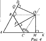Дано: ∆АВС; ВО, СО - биссектрисы. Доказать: О - центр окружности; АВ, АС и ВС - ее касательные. Доказательство: 1) Так как ВО - биссектриса ∠CBD, то OQ ⊥ BD и OF ⊥ ВС равны по свойству биссектрисы угла. 2) Так как СО - биссектриса ∠BCK, то OF ⊥ ВС и ОМ ⊥ СК равны по свойству биссектрисы угла. 3) Вывод: OQ = OF (из п. 1), OF = ОМ (из п. 2), следовательно, OQ = OF = ОМ - радиусы окружности с центром в точке О, а АВ, ВС, АС - касательные (по определению) |