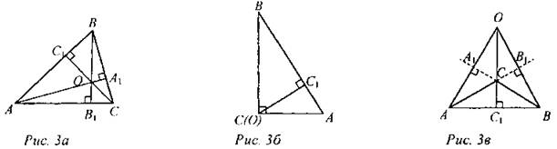 (Ф) — Какие элементы треугольника пересекаются в одной точке? (Биссектрисы треугольника, серединные перпендикуляры к сторонам треугольника, медианы треугольника.) — В каком треугольнике совпадают точка пересечения биссектрис, точка пересечения медиан, точка пересечения серединных перпендикуляров? (В равностороннем.) — Как вы думаете, пересекаются ли высоты треугольника в одной точке? (Варианты ответов: а) да; б) только в остроугольном; в) в остроугольном и прямоугольном.) В ходе обсуждения выполнить рис. 3 (а, б, в).