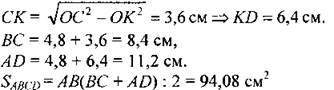 ∆OCD - прямоугольный (так как DO и СО - биссектрисы углов С и D) => CD = 10 см. r = OK = SOCD : (CD : 2) = 4,8 см, значит, АВ = 9,6 см.