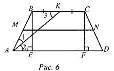 Решение: Так как К - середина ВС, то ВК = КС = ВС : 2 = 16 см : 2 = 8 см. Так как АК - биссектриса КА, то ∠1 = ∠2; ∠2 = ∠3 как внутренние накрест лежащие углы. ∠А = ∠D, АВ = CD, ∆AВЕ = ∆DCF (по гипотенузе и острому углу). Значит, АЕ = DF, ∠АВЕ = 30°, ∆AВЕ - прямоугольный. АЕ = АВ : 2; АЕ = 8 : 2 = 4 см. DF = 4 см, EF = ВС = 16 см, AD = 16 + 4 + 4 = 24 см. MN = (ВС + AD) : 2 = (16 + 24) : 2 = 20 см. Ответ: MN = 20 см |