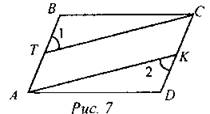 (И) 1. В параллелограмме один из углов в два раза меньше другого. Найти углы параллелограмма. 2. На рисунке ABCD - параллелограмм. ∠1 = ∠2. Докажите, что АТСК - параллелограмм.