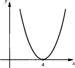 б) Пусть x1 = х2, т. е. а = 4. В этом случае парабола касается оси абсцисс в точке х = 4. Соответствующий график приведен на рисунке. Видно, что значения функции либо положительные, либо их значение равно нулю. Последнее имеет место только в точке х = 4. Эта точка и является решением неравенства в этом случае.