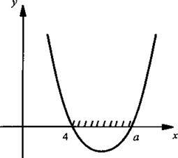 в) Пусть x1 > x2, т. е. a > 4. График приведен на рисунке. Видно, что значения функции y(x) неположительные на промежутке [4; a]. Этот промежуток является решением неравенства для данного случая.