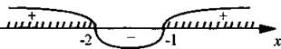 Теперь рассмотрим второе неравенство х2 + 3х + 2 ≥ 0. Корни этого выражения x1 = -2 и х2 = -1. Наносим эти точки на числовую ось. Определяем знак выражения х2 + 3х + 2, например, при х = 5: 52 + 3 · 5 + 2 = 42 > 0. Рисуем диаграмму знаков для этого выражения. Видно, что неравенство выполняется для х ∈ (-∞; -2]U[-1; +∞).
