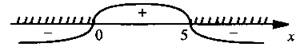 Если 5 - х ≥ 0 (т. е. х ≤ 5), то получаем неравенство (5 - х)(х - 1) + (5 - х) < 0, или (5 - х)(х - 1 + 1) < 0, или (5 - х)х < 0. Решаем это неравенство методом интервалов. Наносим корни соответствующего уравнения: х1 = 0 и х2 = 5. Определяем знак выражения (5 - х)х, например, для х = 2: (5 - 2) · 2 = 6 > 0. После этого рисуем диаграмму знаков.