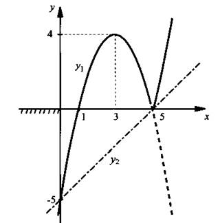 б) Запишем данное неравенство в виде |5 - х|(х - 1) < х - 5. Построим график функции у1 = |5 - х|(х - 1). Для этого раскроем знак модуля. При х ≤ 5 получаем: у1 = (5 - х)(х - 1). В этой области построим график такой функции. Для х > 5 имеем: у1 = -(5 - х)(х - 1). Видно, что эта функция отличается от предыдущей только знаком минус. Поэтому этот график легко получить из предыдущего, если отразить пунктирную часть параболы относительно оси абсцисс зеркально вверх.