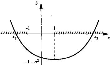 Найдем дискриминант этого уравнения: D = 22 – 4 · (-а2) = 4 + 4а2. При всех значениях а величина D > 0, поэтому уравнение имеет два различных корня. Схематично изобразим график функции у = х2 - 2х - а2. Вершина этой параболы находится в точке (1; -1 - а2). Тогда больший корень х2 всегда больше 1. Для того чтобы меньший корень х1 был меньше (-1), необходимо и достаточно, чтобы значение функции у при х = -1 было отрицательным.
