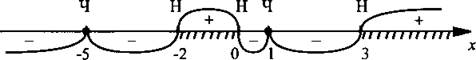 Вернувшись к данному неравенству, отметим, что многочлен имеет корни: х1 = -5 (кратности 8 - четная кратность), х2 = -2 (кратности 3 - нечетная), х3 = 0 (кратности 1 - нечетная), х4 = 1 (кратности 2 - четная), х5 = 3 (кратности 7 - нечетная). Нанесем эти корни на числовую ось и буквами «Н» и «Ч» отметим четность кратности этих корней.