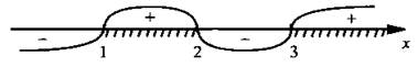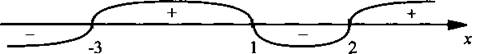 Определим знак многочлена, стоящего в левой части неравенства при любом х, не совпадающем с корнями (например, при х = -3 многочлен отрицательный). Рассмотрим теперь знаки многочлена, двигаясь в положительном направлении оси 0х. Так как х = -2 — корень нечетной кратности, то при этом значении х происходит изменение знака многочлена на противоположный и многочлен на промежутке (-2; 0) положительный. При х = 0 (корень нечетной кратности) опять происходит изменение знака многочлена и он на промежутке (0; 1) становится отрицательным. Так как х = 1 - корень четной кратности, то многочлен знака не меняет и на промежутке (1; 3) он по-прежнему отрицательный. Рассуждая подобным образом, нетрудно получить полную диаграмму знаков многочлена на всей числовой оси, приведенную на рисунке. После этого легко ответить на вопрос задачи: при каких х знак многочлена неотрицательный. Из рисунка видно, что такими х являются ![]()