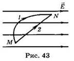 1. В однородном электростатическом поле перемещается положительный заряд из точки М в точку N по разным траекториям (рис. 43). В каком случае работа сил электростатического поля больше?